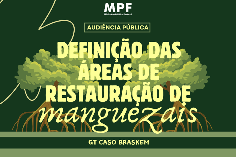 O Ministério Público Federal (MPF) em Alagoas realizará, no dia 16 de março de 2026, a partir das 14h, audiência pública com o tema “Definição das áreas de restauração de manguezal no âmbito do Acordo Socioambiental firmado com a Braskem”. O encontro ocorrerá no auditório da sede da Procuradoria da República em Alagoas, em Maceió, com transmissão ao vivo pelo canal do MPF no YouTube.